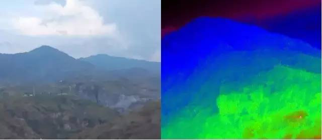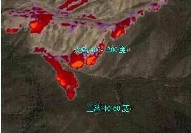 在山區(qū)的紅外熱成像圖像,山火區(qū)域呈紅色一目了然!