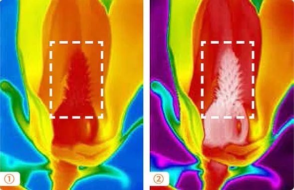 1.熱靈敏度決定熱像儀區(qū)分細(xì)做溫差的能力。同樣情況圖2所用熱像儀的熱靈敏度更低,畫面清晰顯示花蕊細(xì)節(jié)的溫度分布,而圖1同區(qū)域只能看到一片紅色。