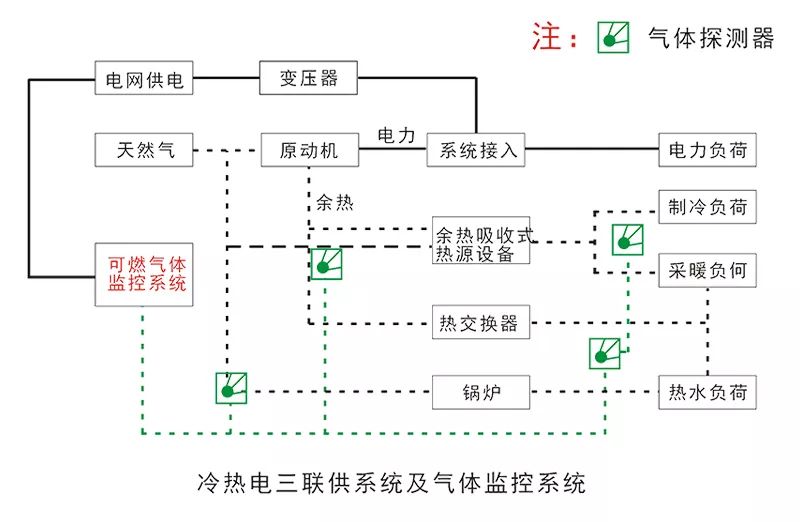 下圖為常規(guī)的冷、熱、電三聯(lián)供系統(tǒng)結(jié)合氣體監(jiān)控系統(tǒng)圖,該系統(tǒng)主要由原動(dòng)機(jī)為核心的發(fā)電設(shè)備、余熱回收設(shè)備、氣體探測(cè)器組成,與電網(wǎng)并網(wǎng)運(yùn)行。