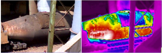1 檢測魚雷罐車的內襯:內襯因受到化學侵蝕、機械沖刷和急冷急熱而引起的裂紋、鼓包、脫落等。當耐火材料局部損毀嚴重,而又未被發(fā)現(xiàn)時,將造成嚴重的事故。用紅外熱像儀可以檢測內襯的損毀狀況,避免事故的發(fā)生。