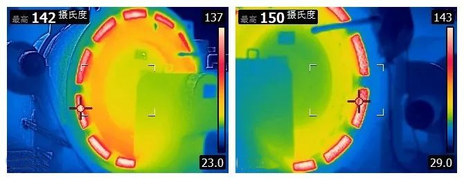 但是通過(guò)KT384紅外熱像儀的檢測(cè),可以直觀地看到電磁剎車(chē)溫度高達(dá)150度,若內(nèi)部線(xiàn)圈絕緣程度不夠,則很容易造成絕緣程度下降。