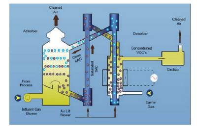 利用吸附劑(粒狀活性炭和活性炭纖維)的多孔結(jié)構(gòu),將廢氣中的VOC捕獲。將含VOC的有機廢氣通過活性炭床,其中的VOC被吸附劑吸附,廢氣得到凈化,而排入大氣。