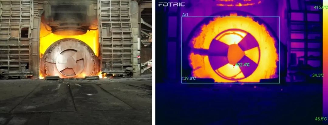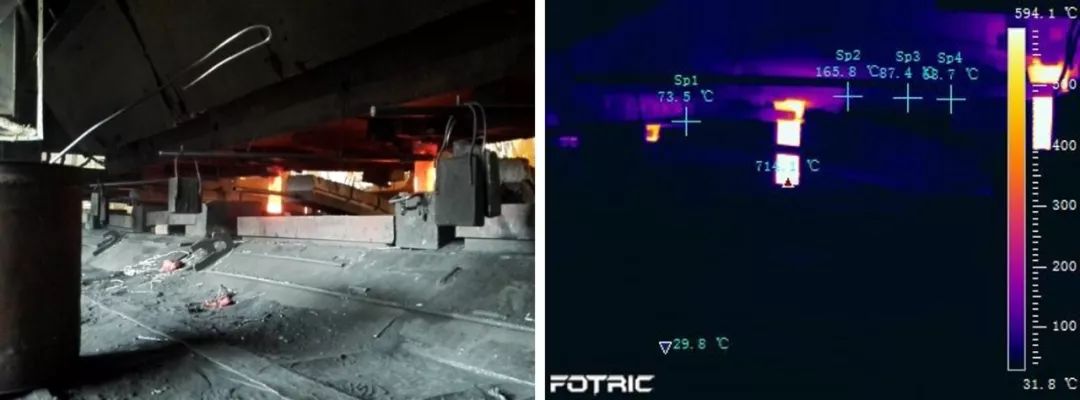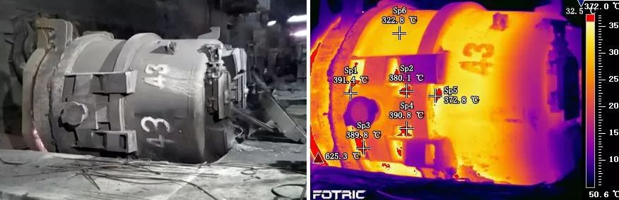中間包是連鑄作業(yè)區(qū)防范鋼水泄露的重中之重。同樣,當(dāng)它的內(nèi)襯耐火材料不斷被侵蝕導(dǎo)致包壁厚度減薄,也會引起中間包包表面溫度升高,用熱像儀來檢測,及早發(fā)現(xiàn)問題及時(shí)預(yù)警。